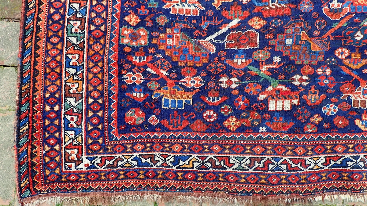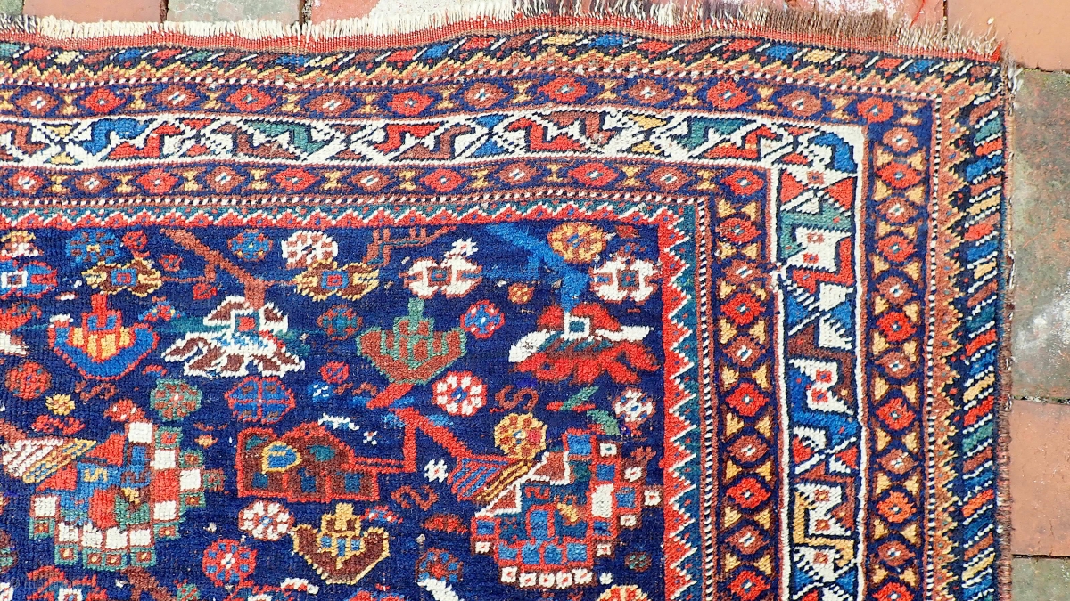 Khamseh sw-- 4.4 x 5. Tribal motifs with soft wool and myriad colors. These are delicate pieces usually found worn out. This one is unusually fine condition.