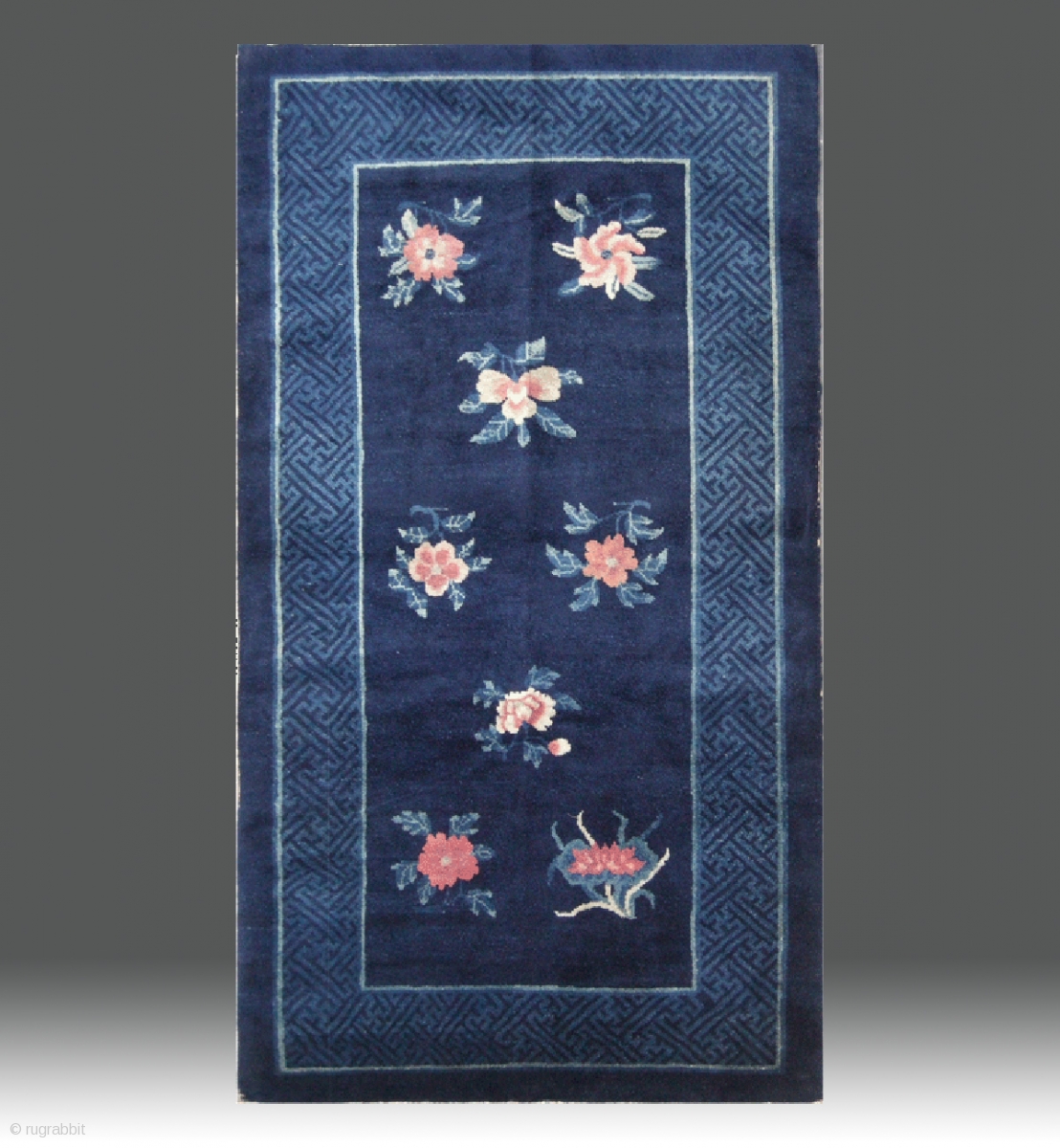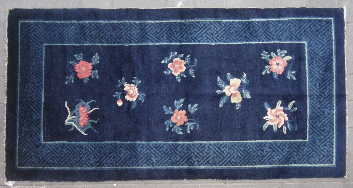 No.R173 * Chinese Antique "Flowers Design" Rug. Age:19th Century. Size:94x179cm(37"x70"). Origin:Baotou. Shape:Rectangle. Background Color:Blues.