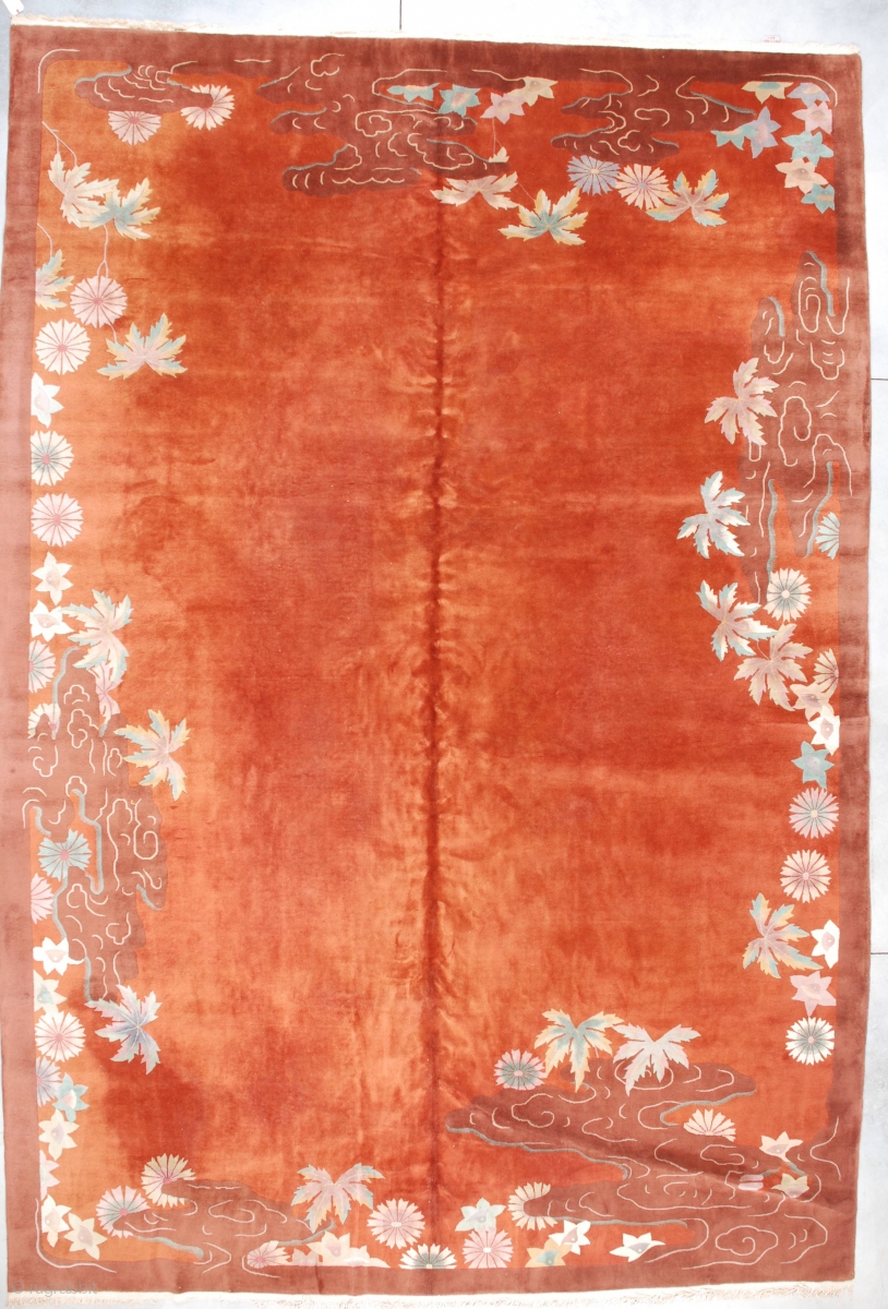This circa 1925 Art Deco Chinese rug measures 12’0” x 17’8”. It has an orange autumn leaf colored background with an open center surrounded by gigantic leaves in aqua marine, teal and pale lavender colored leaves. The leaves are interwoven into a very dreamy water motif appearing very much like swirling lakes in cinnamon brown. This is a stunning and spectacular effect for a huge rug. The rug has very good pile. The ends and sides are complete. The rug is clean and ready to go. The buyer pays the shipping and insurance of $225.00.