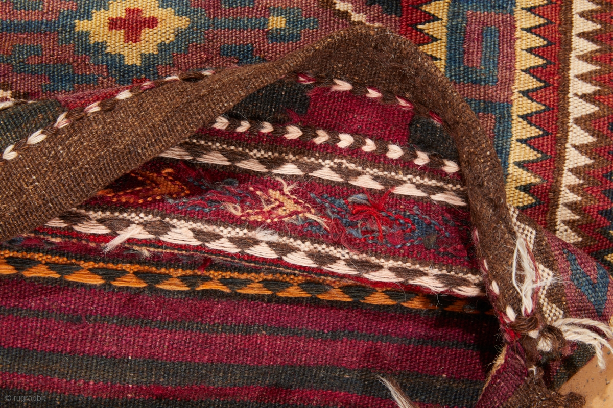 Uzbek Tartari saddle bag 149x45cm complete. a perfect example of double interlock wave technique. Beautiful range natural colors including green, light blue, saffron yellow, aubergine, ecc. that have been mellowed by Mr Time. Gently washed. No stains, no damages. In very good conditions with only one fingertip repair on the back. It comes with original loops. Very hard to find complete! Please ask for Hires photos and price. If you have any problem with rr mail please contact enricfontolan75@gmail.com