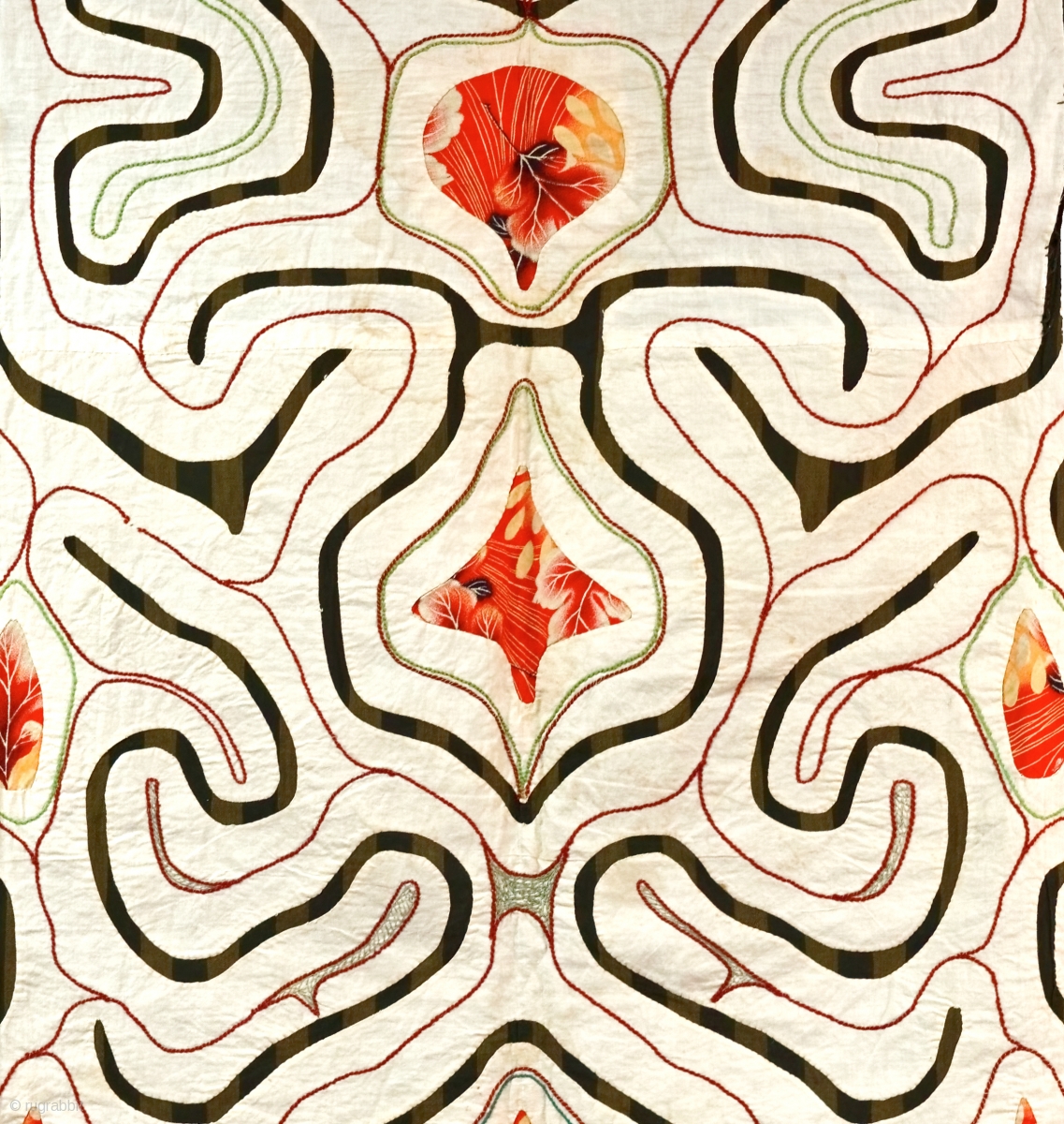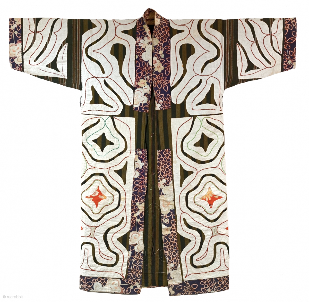 This particular garment originated in the Hidaka region of southern Hokkaido. The base cloth of the body is a handsome brown shima, or stripe, cotton. Printed commercial cottons of red florals were added as central accents. Next an overall white cotton applique was laid on top and everything was finished with chain stitched embroidery using green and red thread. The borders incorporate a contrasting purple printed floral pattern on commercial cotton.