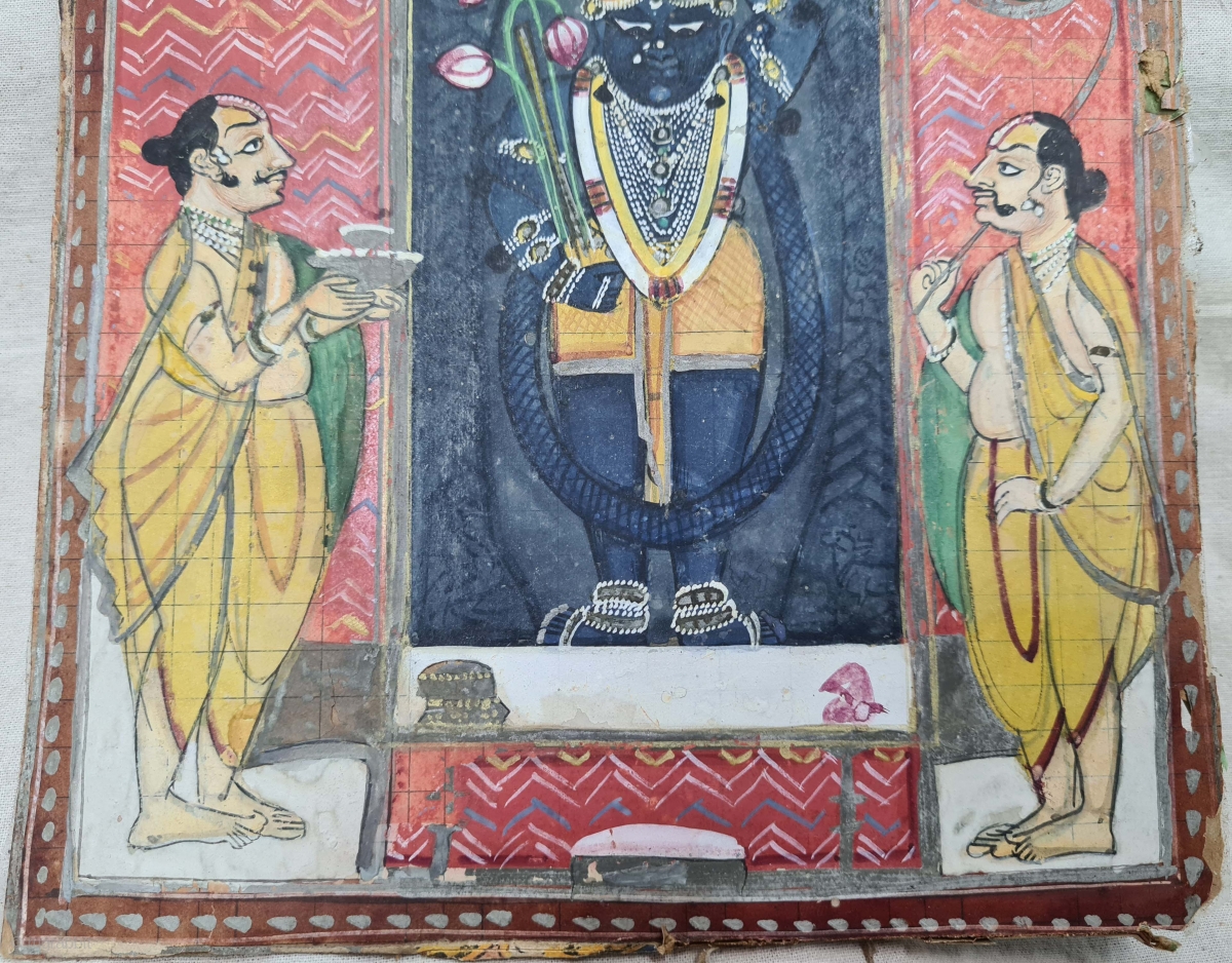 Miniature Painting of Mangala Darshan of Shrinathji with Lahariya Design. From The Nathdwara of Rajasthan. India. Mangala Darshan is the First darshan of the day. Lord, having woken up, has just had His breakfast and greets his devotees with the most "auspicious" darshan of the day. This darshan usually occurs at dawnC.1825-1850Its size is 20cmX25cm(20210612_145413).
