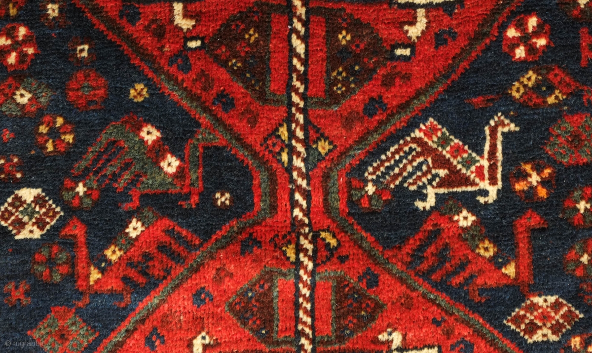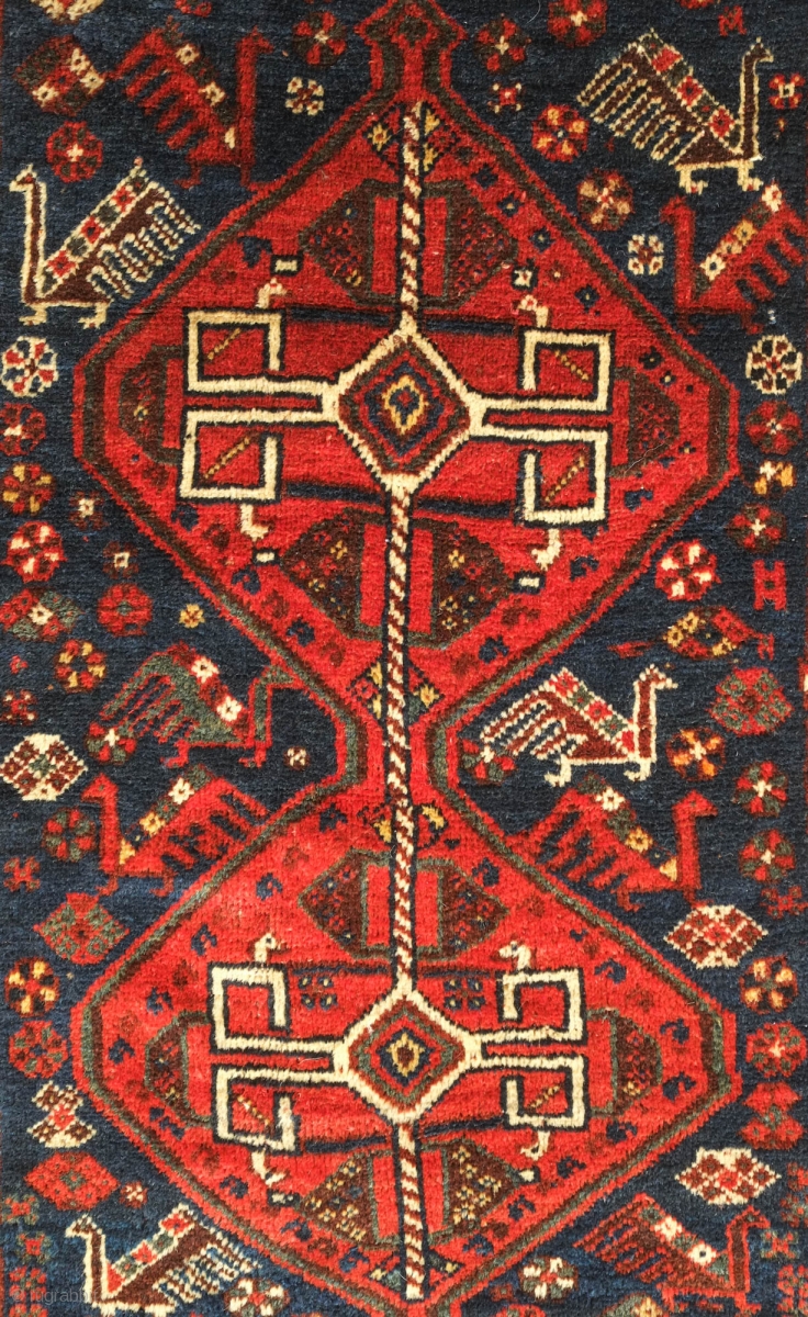 Shiraz area small rug, Late 19th or early 20th century. Thick, lush pile. Excellent condition. Original selvedges. Atypical size. Wonderful bird motifs scattered about.