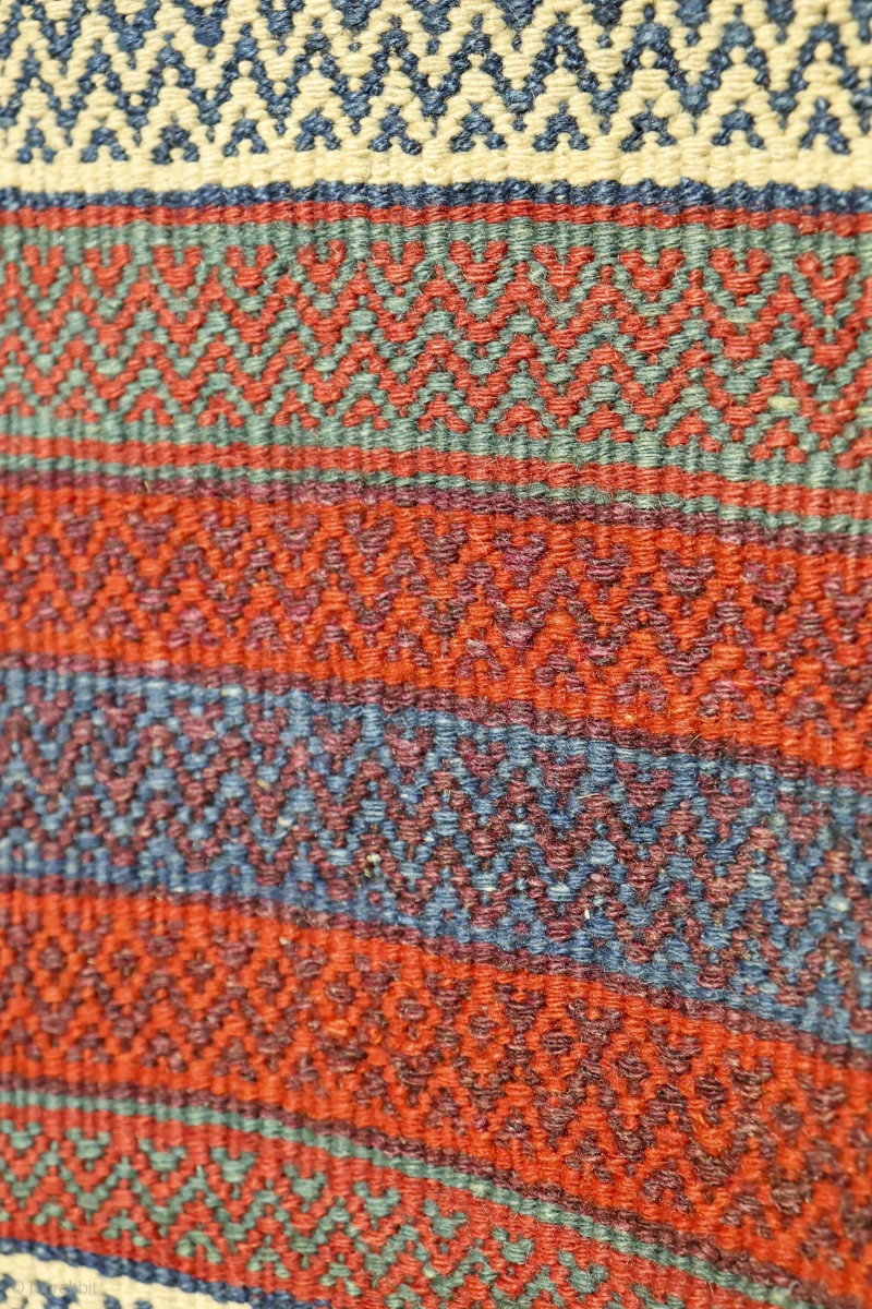 This Luri saddlebag has been woven with the knotted technique at the front and with kilim for the back. All dyes are natural (with a beautiful blue and green) and the wool is soft and shinny.