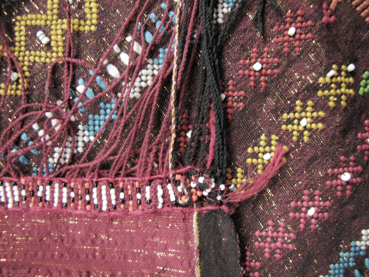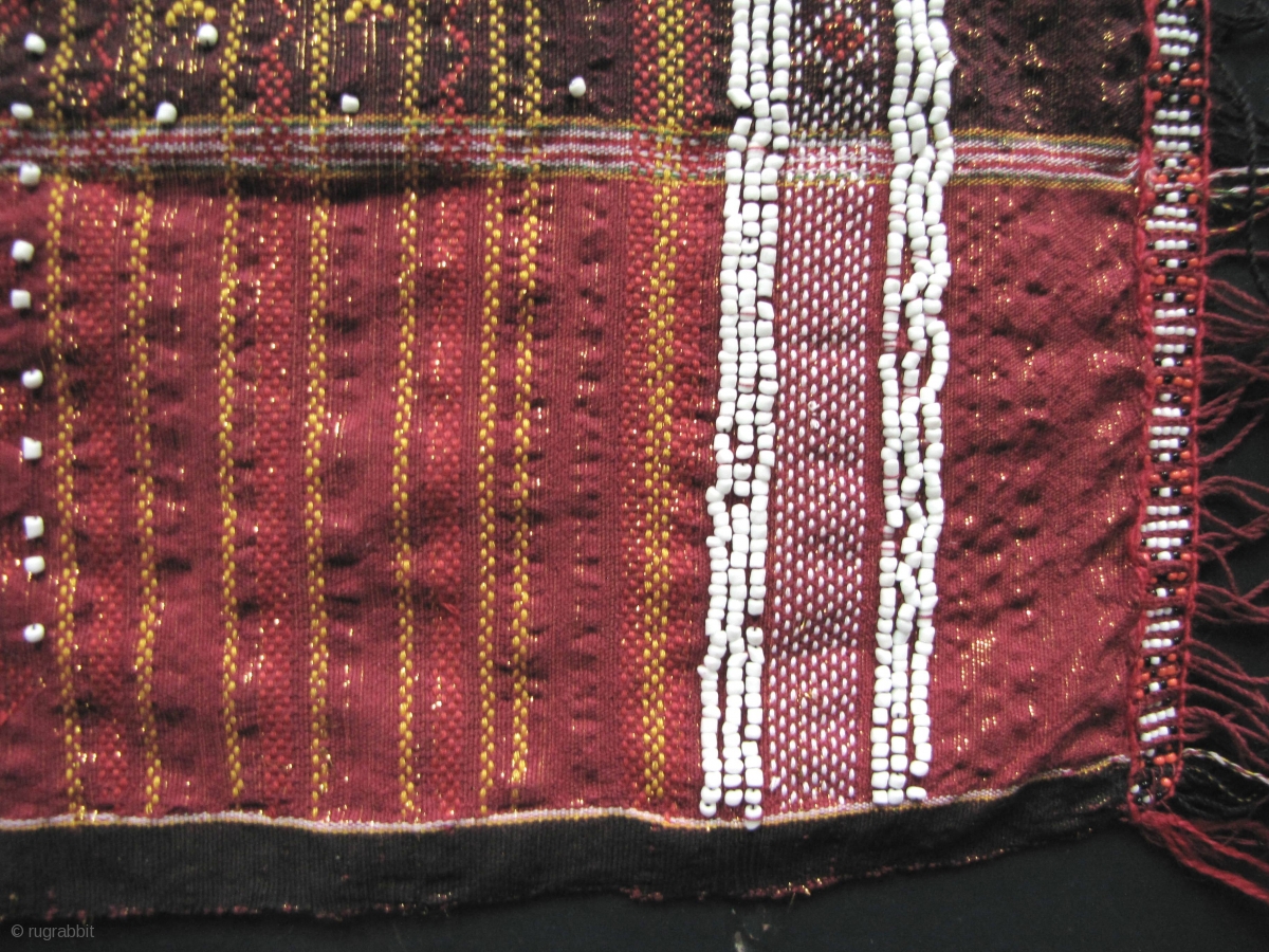 Colorful hand woven beaded shoulder cloth from the Batak people, Sumatra. This piece is quiet lively and complicated with gold treads, and large “Rasta” colored diamond patterned warp embroidered bands. The “Dame Madi Hita” is Batak language and is embroidered on both sides of the center which refers to a blessing bestowed by the giver to the recipient. Ulos cloths play an important role in Batak communities in that they are ritually used to express affection and sincerity between people thus strengthening social and family bonds. This kind of Ulos is called a “sadum” and is used by the Southern Batak group who live around Lake Toba. d 2.13m x 77cm. 2.13m x 77cm