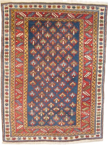 The knots, the warp and the weft threads are hand spun wool. The black knots are oxidized, the background color is blue with allover geometric design, the surrounded large border is terracotta, the selvages are rolled on one line, both edges the fringes are replaced, thick pile, in good condition, soft as an handkerchief and high standard quality. A similar example was published in the catalog of "Caucasian Carpets" by von Doris Eder on the page 359, plate 413.