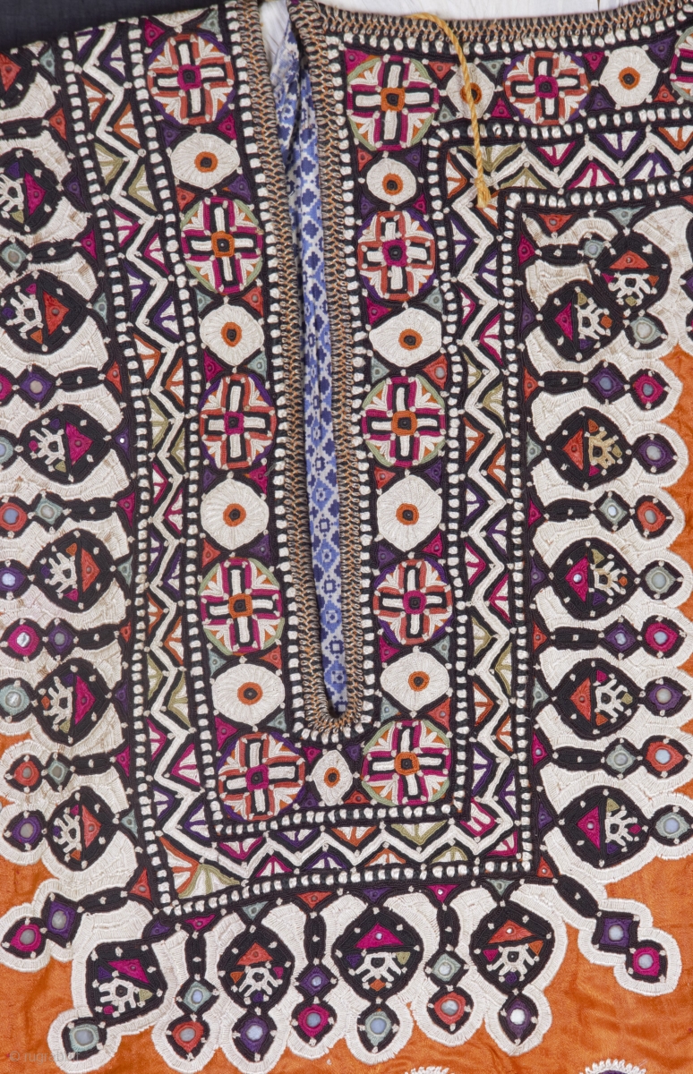 This is Spectacular piece of mica or mirror, produced to give a radiant touch of glitter and shimmer to the art work, its a child dress with a beautiful side cut neck line with eye pleasing Sindh embroidery.