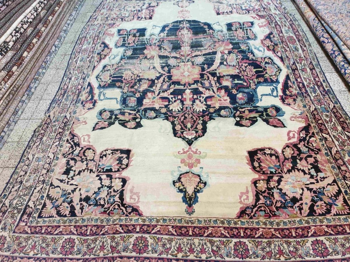 Antique Kerman carpet with astonishing medallion , the carpet is worn particularly in white areas of field.