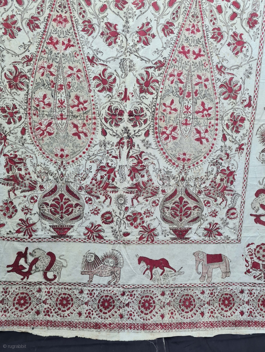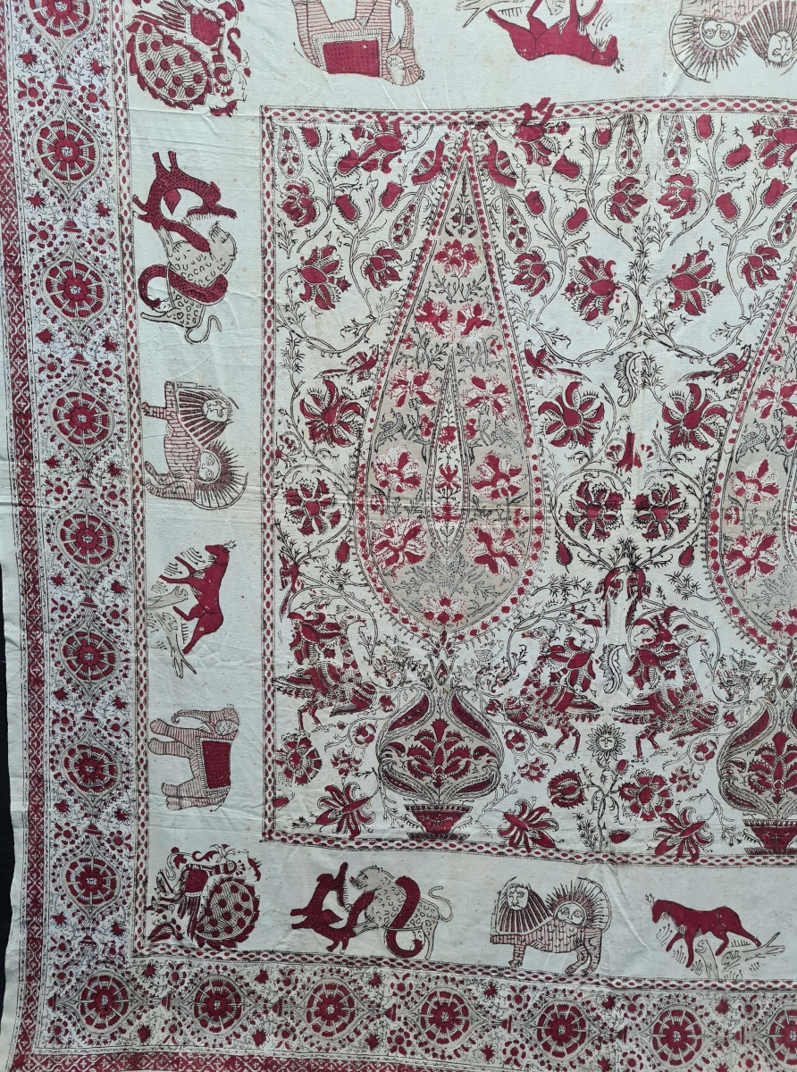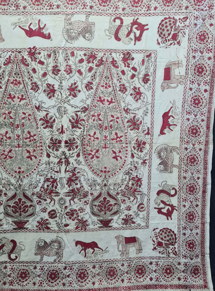 Kalamkari Palampore Hand-Drawn Mordant-And Resist-Dyed Cotton,From Coromandel Coast South India. India. Showing the exotic birds, peacocks, tigers, stylized mountain Sun, and cypress trees.