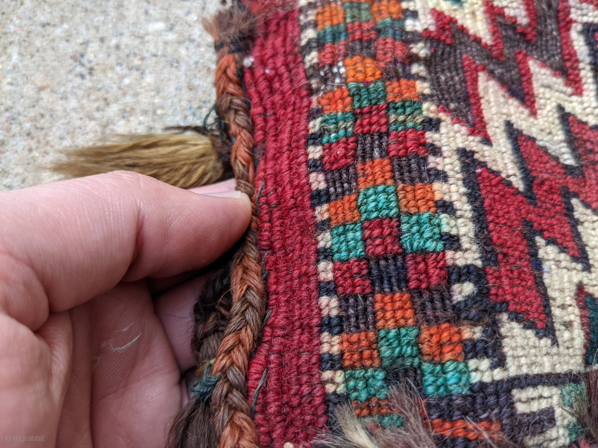Old Yomut dizlyks, camel knee covers. 9" x 12". One has a great green color with original tassles. Full pile except one area of oxidized brown.