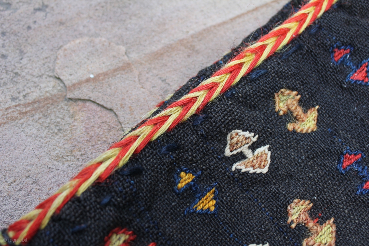 a top Qashqai spindle bag made using a flat-weave technique and all natural dyes. It measures 1.1 x1.7 Ft