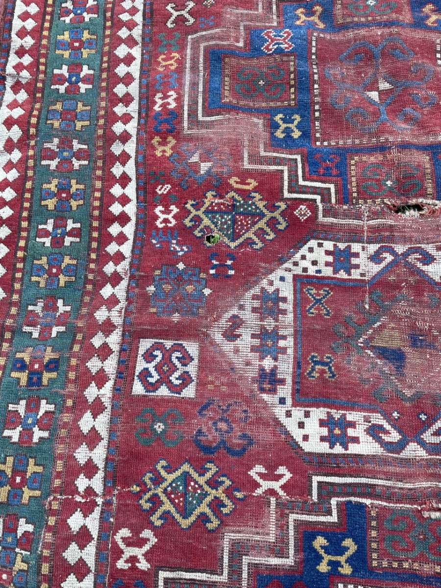 Dirty bashed up Kazak. Couplw of holes, rips and tears bur great colours and design. Ans despite its issues a great rug. Turkish repair special? 7 x 5 feet