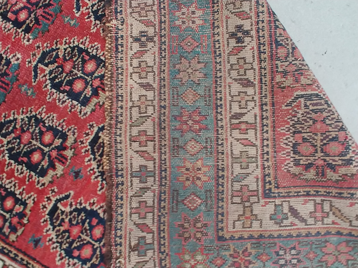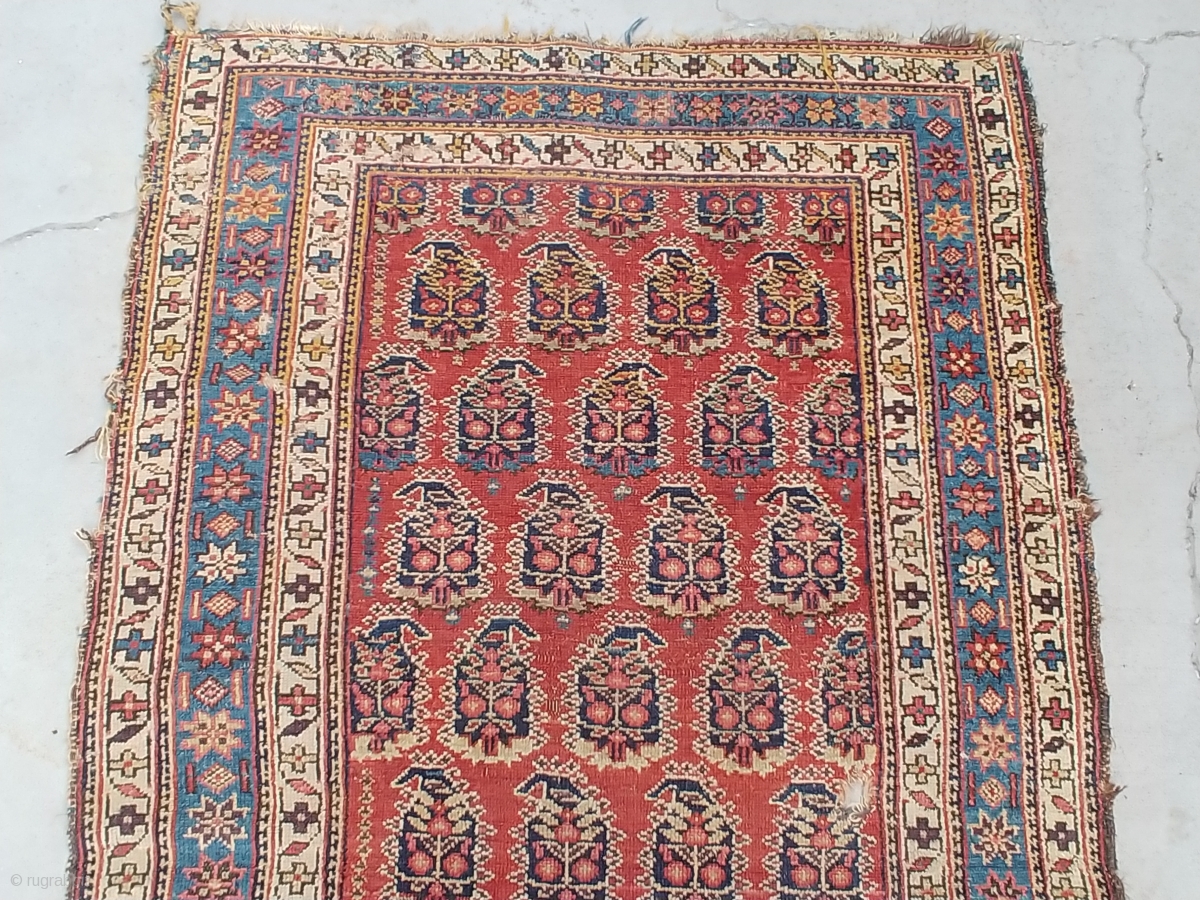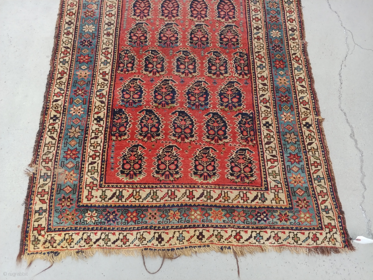 i believe this Kurd runner to be of the late 19th century. The soft rosy red background of the field and the soft light blue main border with its flanking white minor borders should brighten up even dark hallways or corridors. The nicely formed botehs do not overcrowd the field as i have seen in other rugs with like design. The thinly beaded filler lines along the sides of the field together with its geometric borders give it a bit of a tribal feel. i have photos of each section of the runner which i could send to people interested. It measures 3.5 ft at its widest width and is 13.7 ft long. Selling as found and has not been cleaned.