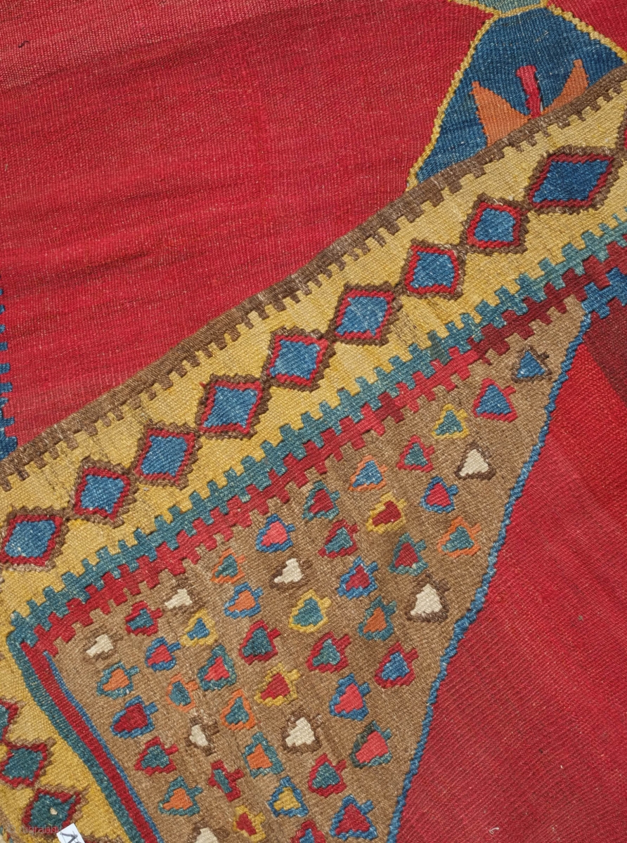 Bijar Kilim, 19th century. Deeply saturated jewel-like colors. There is something undeniably spiritual about this piece. The top and bottom diamonds feature sun motifs with either birds linked wing to wing or inward facing rows of dancers in a ceremony or special event. The multi-colored speckled corner pieces are like a splay of flickering gem stones. 167 x 410 cm