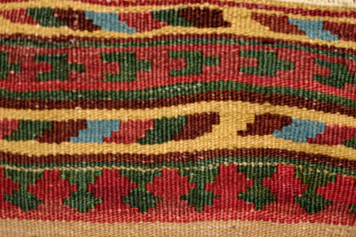 Qashqa'i small sofreh, 3rd to 4th quarter of 19th century. It may be what is referred to as a tea sofreh for use for a tea service. Fantastic saturated natural colors. Eight different colors plus a resonating camel wool field with natural abrash. One small repair in camel wool in the field but unnoticeable and a few equally unnoticeable small repairs along the green lale abbasi border. This is a simple piece but it hums. 44 x 69 cm.