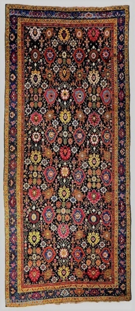 Classical Karabagh long carpet, ca. 1800-25, length slightly invisibly adjusted, now 7.3 x 18 feet (252 x 550 cm). No re-knotting, very good pile, slight wear in a few areas. Original selvedges and ends. Sparkling array of many natural colors, including some true camel hair. Absolutely stunning period piece. www.MAQAM-rugs.com