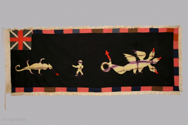 Fante society banner, Asafo people, Ghana, cotton fabric, before 1956, 42 x 106 inches. These banners usually illustrate Asafo proverbs. In this case, the proverb expressed is that if a man wished to escape harms that might come from anywhere, land ,sea, and sky, ( the dragon) then one must become like a chameleon and be able to blend into all surroundings and escape any harms unnoticed. This is an exceptionally large and striking banner. the use of resist dyed fabric for the three figures is also unusual. The condition is very good.