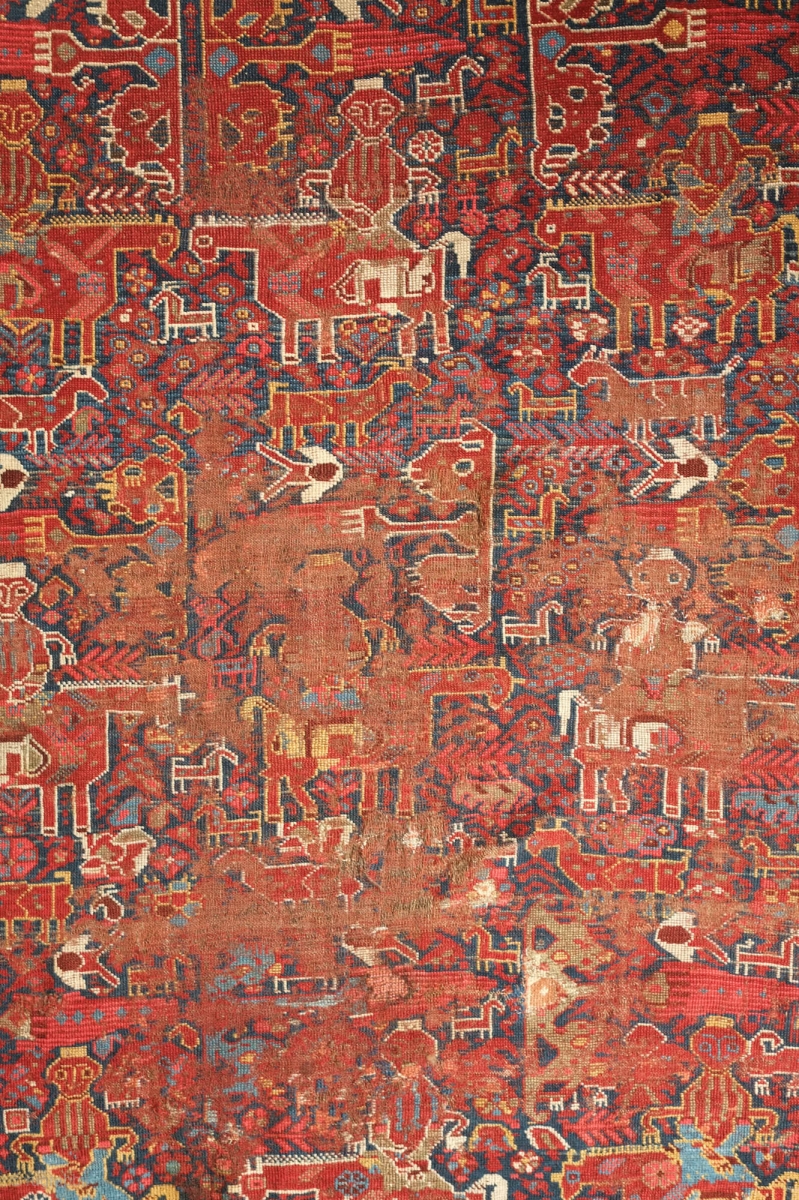 Khamseh rug, 3rd to 4th quarter of the 19th century. a wonderful array of mounted tribesmen in the field amidst unique half abstract winged medallions. The field is filled with small and large goats, other animals and a variety of floral and other motifs. 126 x 167 cm.