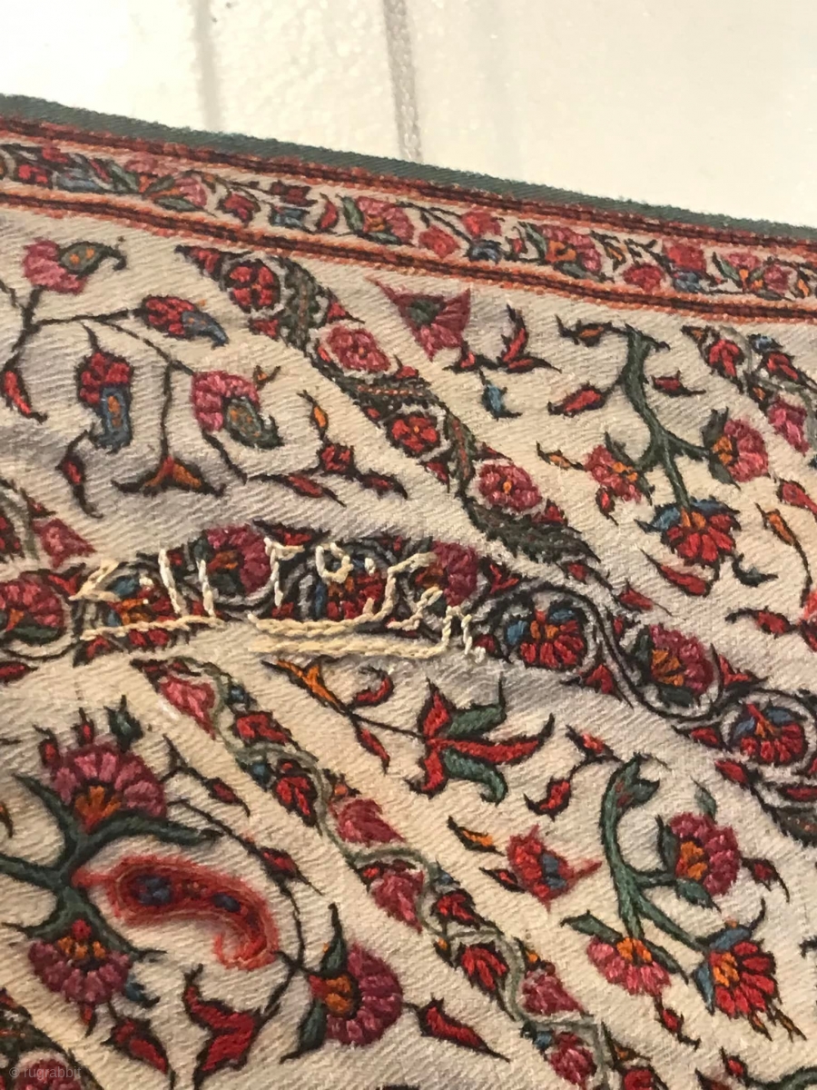 Pashmina long shawl. Softest oldest of this type that I've ever had, circa 1900?? 8'6"x 3'9" Scattered small moth holes on plain ends. None in field. Domestic sale only.