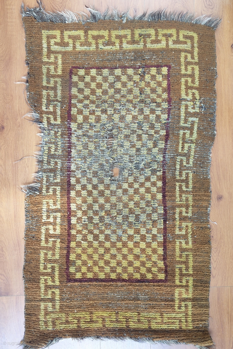19th c. checkerboard small tibetan rug with uncommon and interesting design proportions and thick yak wool warps.