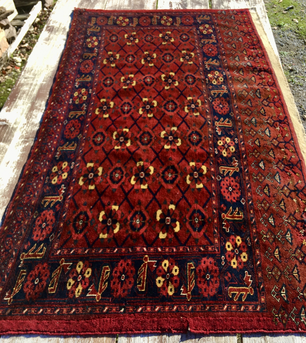 Turkmen Beshir cuval/storage bag face with Mina Khani pattern. Big size: cm 104x176. Should be datable 1880/1900. Great Mina Khani design. Lovely natural bright colors: super yellow, various reds. Very tight weaving. High pile. Very heavy. Condition issues: moth problem, one tear.