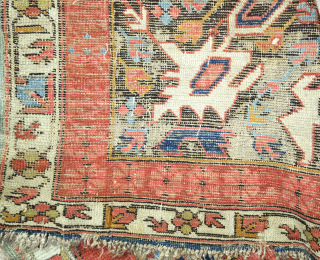 Starburst Caucasian Zeichur rug with a dark corroded ground, very colorful with a sculptural effect.