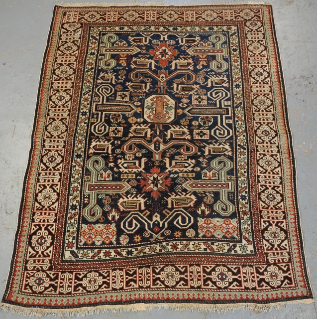 Antique Caucasian Kuba region Perepedil rug with an indigo blue ground and classic Kufic border. www.knightsantiques.co.uk