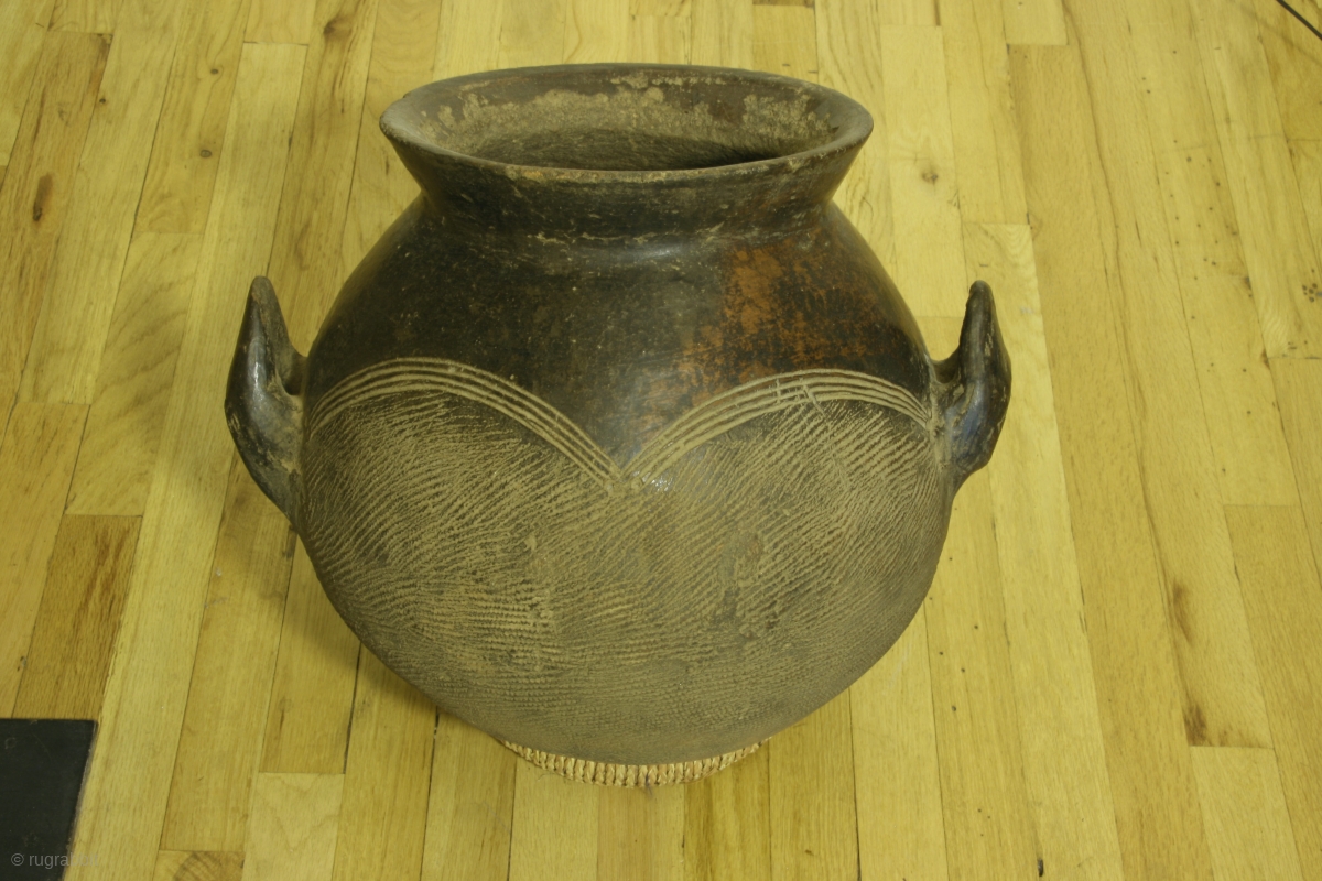 Africa, ceramic storage pot, Burkino faso, 18 inches high, 17inches across the handles, 20thcentury.