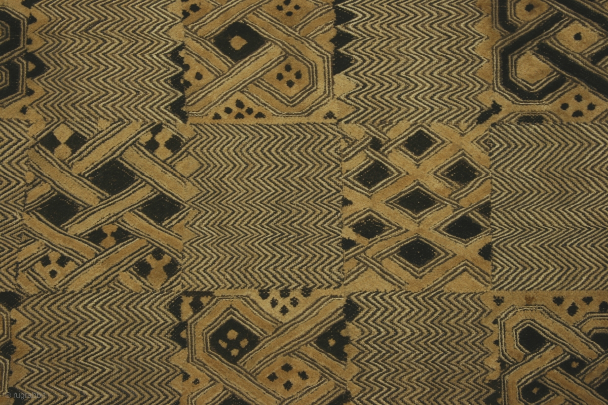 Africa, Kuba Kingdom, Showa region, d.r.c., large rafia embroidered and cut pile patterned large ceremonial panel( or posssible skirt), 20 x 33 inches, mid 20th century. An unusual scale and striking design. Excellent condition.