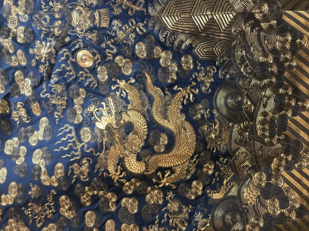 19th century Chinese panel. 55" x 69" Metal and silk thread embroidery on silk. Excellent condition. Located in Chicago. Domestic sale only.