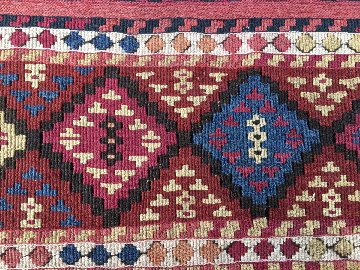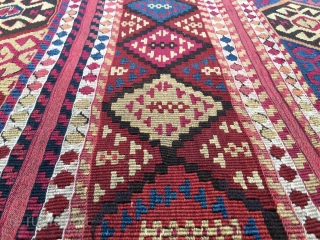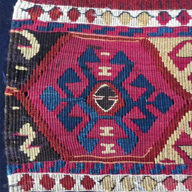 Wonderful antique natural color Sinanli tribal group bag face. Eastern Anatolia. Cm 69x73. See the fantastic cochineal, the lovely madder red & orange, the bright yellow, the deep indigo blue.....Great unusual thin weave in between the two compartments. Some metal thread. In very good condition. Available.
