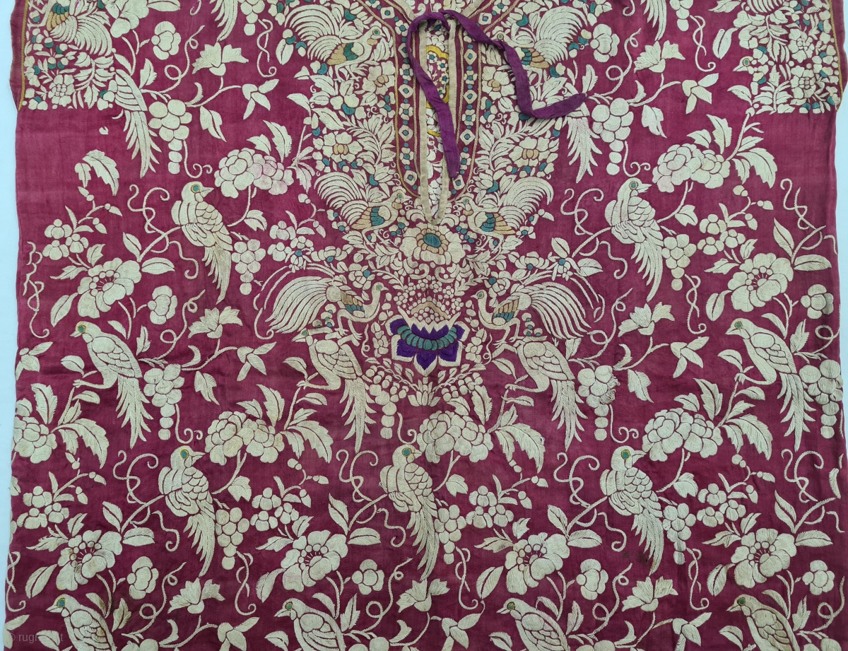 Chakli Nu Jhablu , Parsi Jhabla or Jhablo (Blouse) From Surat Gujarat India. The ‘four over, under one satin weave is embroidered with Birds and Flowers Jaal design.This kind of Jhabla's were embroidered by Chinese artisans in the town of Surat in Gujarat for the Parsi women of that region.The Parsi's are a Zoroastrian community in the Indian subcontinent. They are non Muslim Persians that were driven away from Iran when it became Islamic.