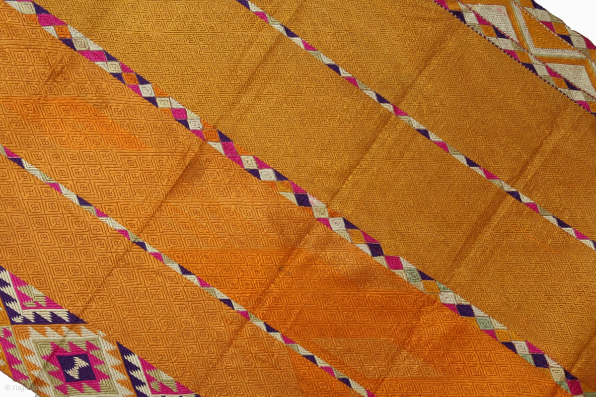 Phulkari From West (Pakistan)Punjab India Called As Vari-Da-Bagh.Rare Panch Rangi Borders Both Side Design.Floss Silk on Hand Spun Cotton khaddar.This bagh was gifted to the bride by her in-laws when she was entering their house, her new home, on the wedding day.(DSL05140).