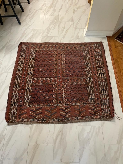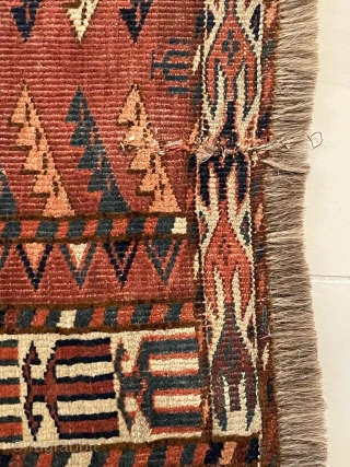 This is an Ensi Turkman with a few different elements making it interesting and different from the standard Ensi. Its size is 4.5x4.10 ft and in overall good condition with all natural colors. It has one small tear that has been unprofessionally sewn back together.