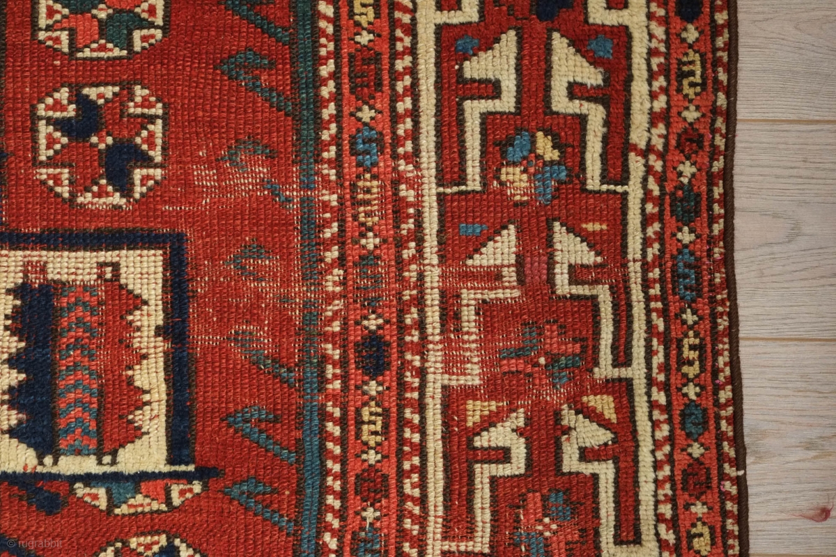 Kozak/Bergama rug, 1850s or so. Great classic design harkening to classical 15th century rugs. This has decent pile and a repair in the border shown in the last image. Light wear in a small section of the borders. Dynamic and powerful with some wonderful archaic elements. 157 x 200 cm