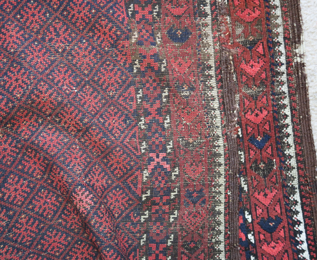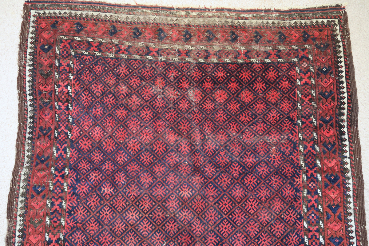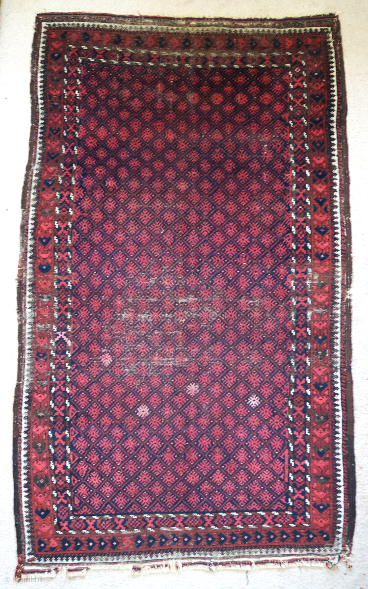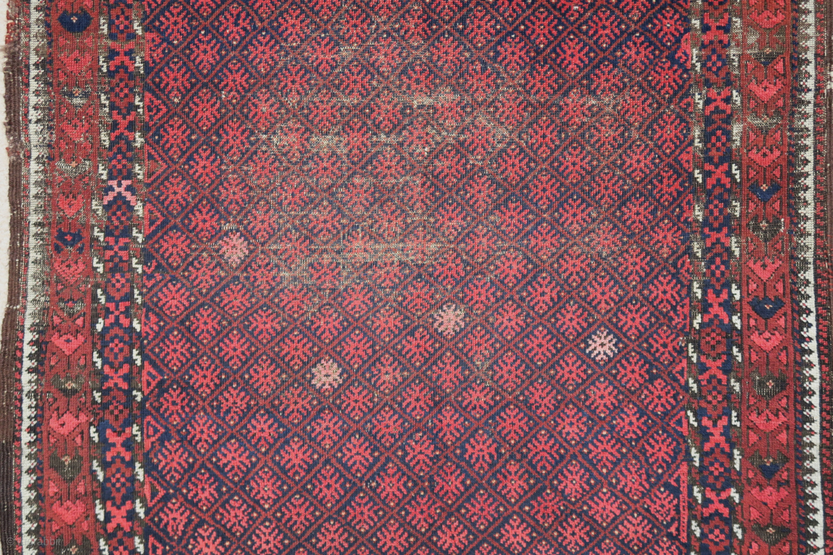 Baluch rug with a small-scale embroidered design rendered in pile. Narrow border, uncommon type, 4x6ish