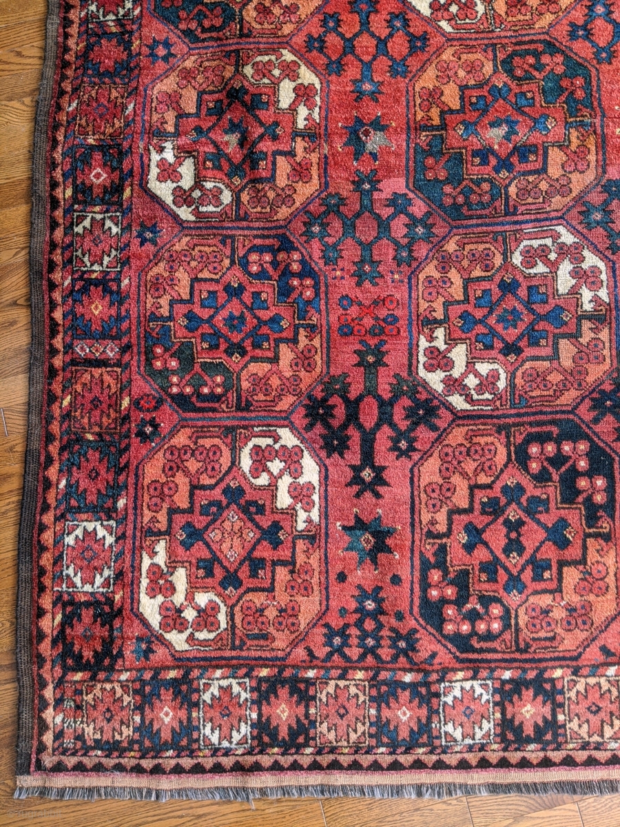 a dynamic Ersari (Uzbek?) main carpet. 100" x 77". Very good condition, with thick pile throughout most of the carpet. a strip of repair at both ends. sold (thanks).