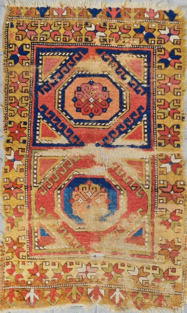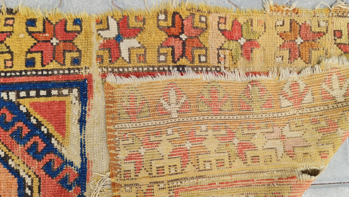 Wonderful yellow from stale straw and wonderful apricot colors from buckthorn plant. The peddler brought it from the Greek village of Cappadocia / Gelveri region.