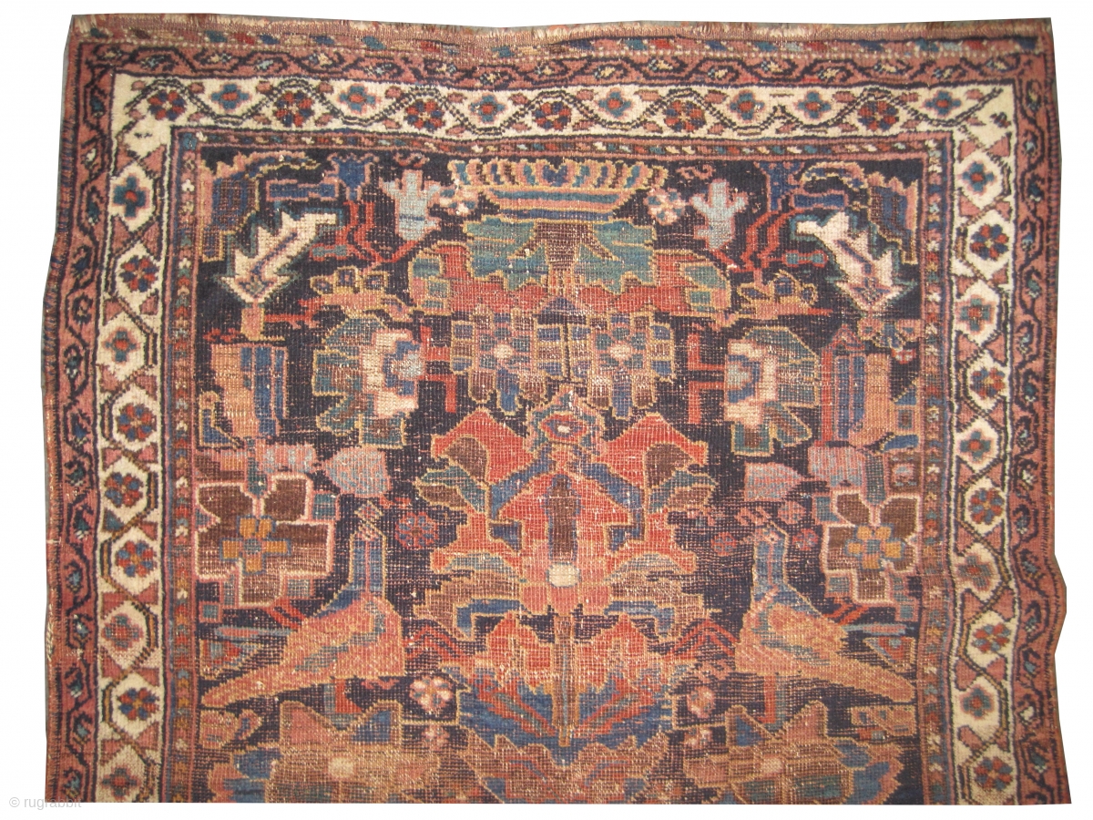 Vase design surrounded with pigeons, the background color is indigo, the surrounded large border is ivory, the black knots are oxidized, the warp and the weft threads are wool, the knots are hand spun wool, one edge is woven with kilim, fine knotted, soft as and in its original shape.