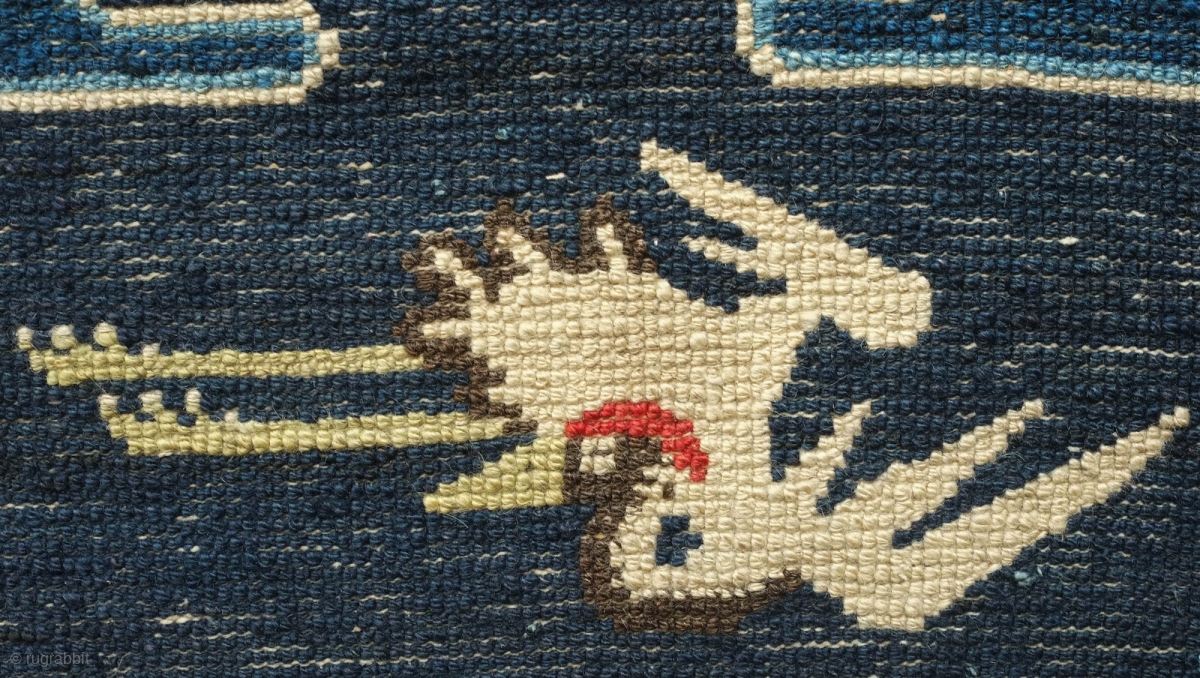 Pao Tao Rug, c. 1900 or so. Very soft wool. Two crane figures symbolizing longevity. Wonderful fleur de lis-like motifs for the inner border. The cloud at the top has an interesting Art Deco style of drawing. 64 x 117 cm