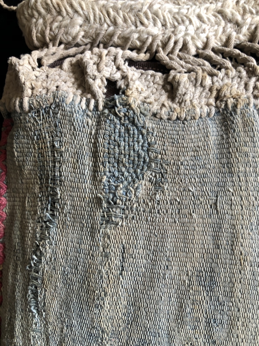 Incan period bag with separately woven pendant fringe. Native repair made in ancient times. Blue cotton bag with alpaca fiber pendant, tassels and side finish. Size: 8 x 20 inches including fringe.
