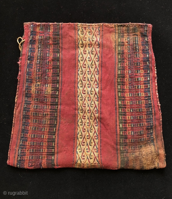 This large coca bag is a superb example of a type identified as belonging to the Maitas-Chiribaya Culture of Northern Chile. It dates to a.d. 500 - 1000. It is a very finely woven textile with an amazing handle and desirable color palette found in only a small percentage of of the weavings from the region. See image here of a length of fine German made sewing thread compared to the much finer hand spun yarns of this textile to get the sense of just how fine the two ply the alpaca yarns in this weaving really are. It is a classic Andean warp faced woven bag with complimentary warp patterning. Size:12.5 x 11.5 inches. The bag has been professionally stabilized to a fabric lining for conservation purposes. This group of bags often display a subtly flared shape as seen here. i include images here from one of the few publications to describe this regional culture along with a nicely rendered depiction of the people and costumes of the region. Even considering its slightly rough condition with some discoloration and wear, this is the kind of piece that knowledgable and sophisticated collectors of Andean material will admire for how beautifully woven it is and for how it ranks within in the group of such weavings. Priced very well considering its status and beautiful weave.