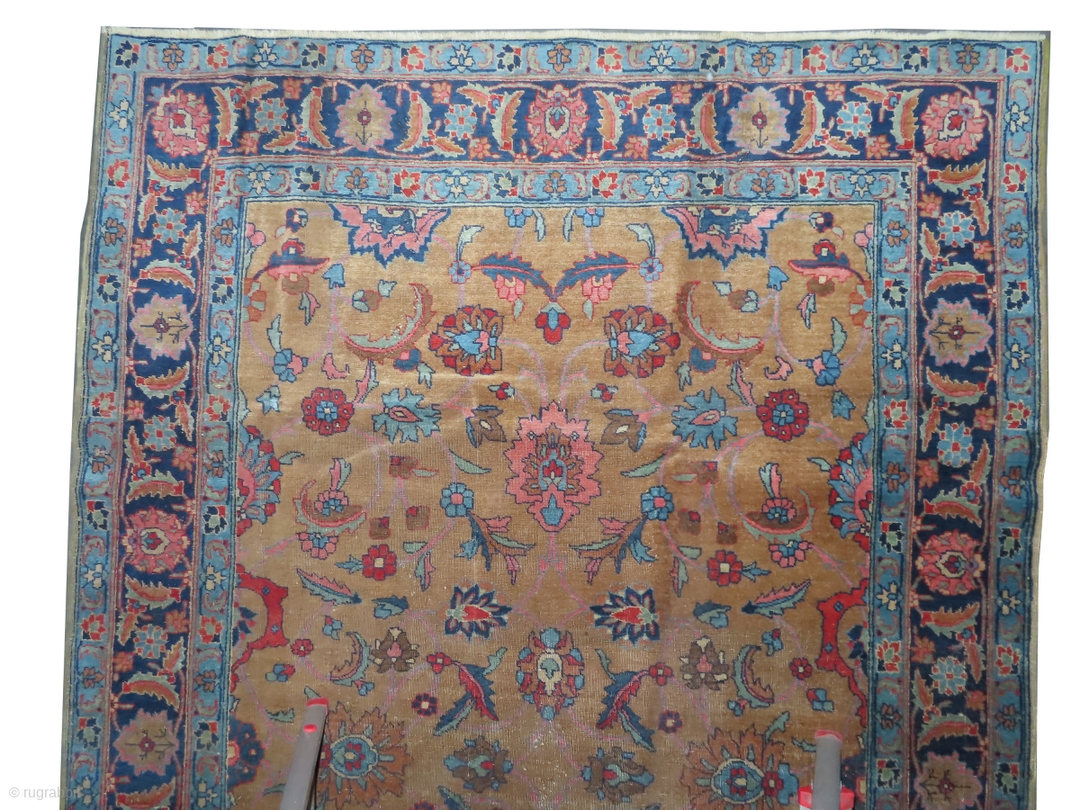 The knots are hand spun lamb wool, all over floral design, the background color is light cinnamon, the surrounded large border is indigo, certain places the pile is slightly short, rare example, finely knotted, in its original shape.