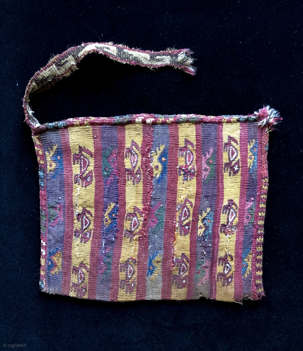 Captivating little Pre-Columbian bag. Very unusual style with edge finishes like some provincial Nasca/Wari textiles. a.d. 600 - 1200. Stylized zoomorphic figures travel in rows across the width of this bag. They resemble bird and lizard-like creatures. Very interesting and atypical color combinations in the bag. Cleaned and conserved, but a bit disheveled. From an old collection. Size: 7.25 x 6 inches.