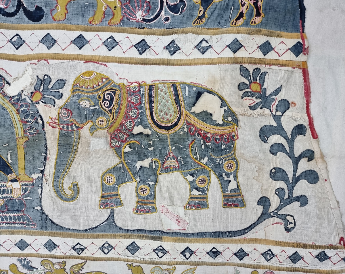 Unique and Rare Temple Hanging Applique work from South India. India. Cotton with cotton Applique work. Showing the Lord Krishna with both side Elephants Surrounding with Beautiful Lions and Tree's.