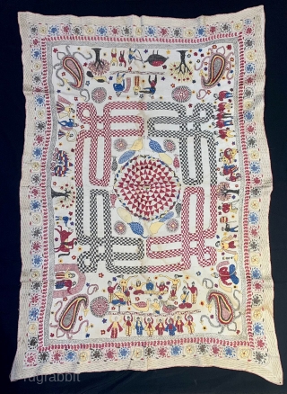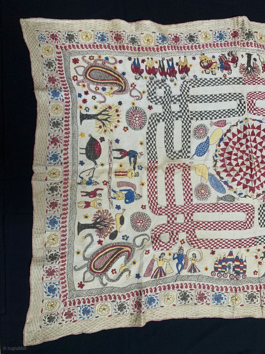 Very Rare Embroidery Kantha from Jessore Region of East (Bangladesh) Undivided Bengal India. 1900c. With Krishna life story and other subjects also embroidered with very rare colour patterns used in the Kantha which makes it rare and special the size of the Kantha is 83 cms x 129 cms.