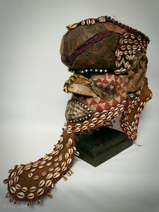 Royal Kuba Elephant Mask Congo. Size is cm 34 h, 36 w and 23 deep. Weight is a bit over Kg 2. Datable 1940/1950. Wood, cowry shells, copper, iron, fabric, beads. Actually more an helmet than a mask. Called elephant because of the trunk which in reality is a beard. It’s an initiation mask. Richly decorated and with a lovely patina. See the very nicely cut ears. The dancing was performed very slowly since the dancer could not see anything. The mask is blind. Just out a Belgian collection.