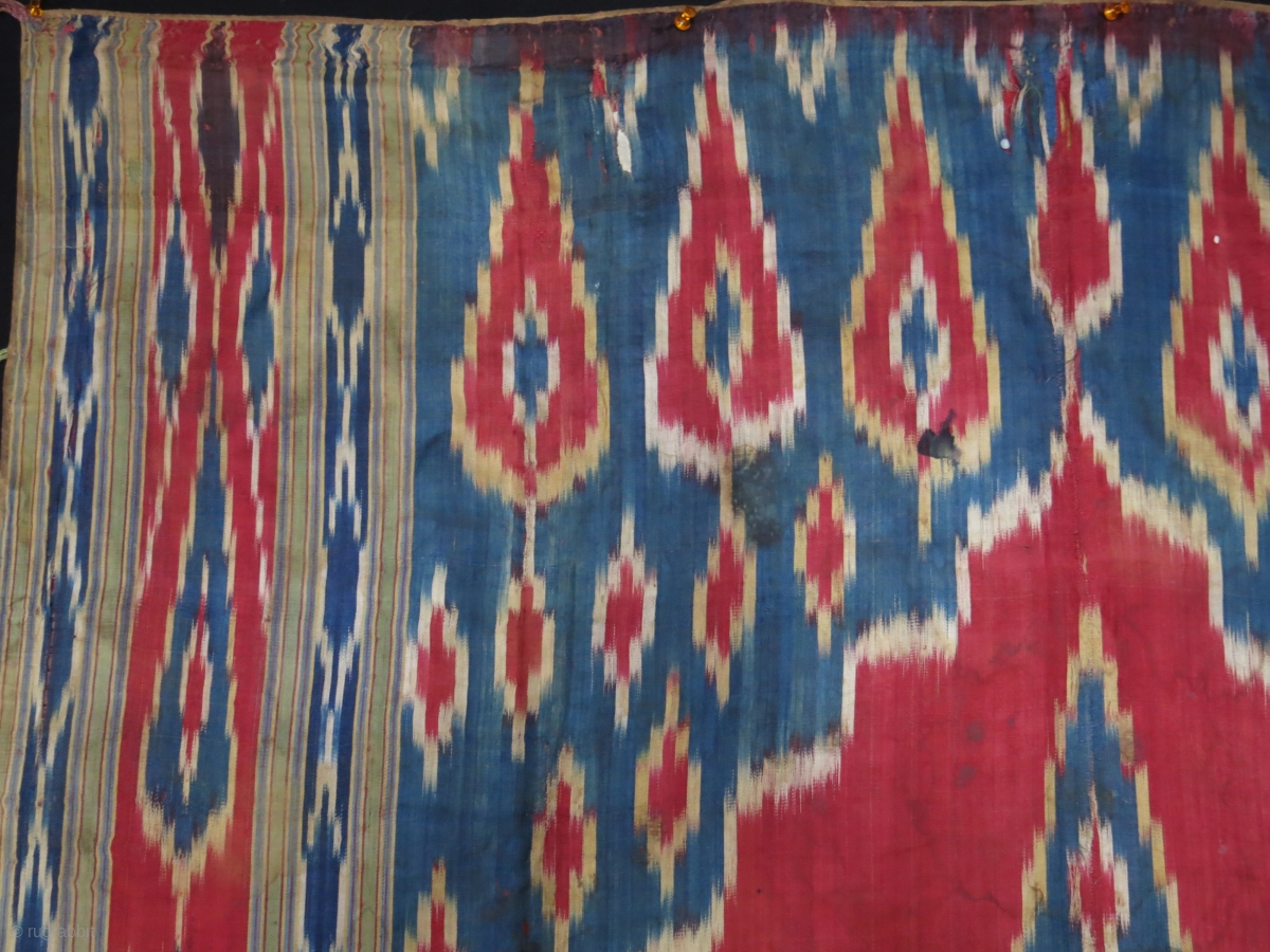 Persia Yezd Zoroastrian silk ikat hanging condition issues, some old over stitching repairs. Hand loomed cotton backing. 19th cent. size : 79" x 46.5" - 199 cm x 118