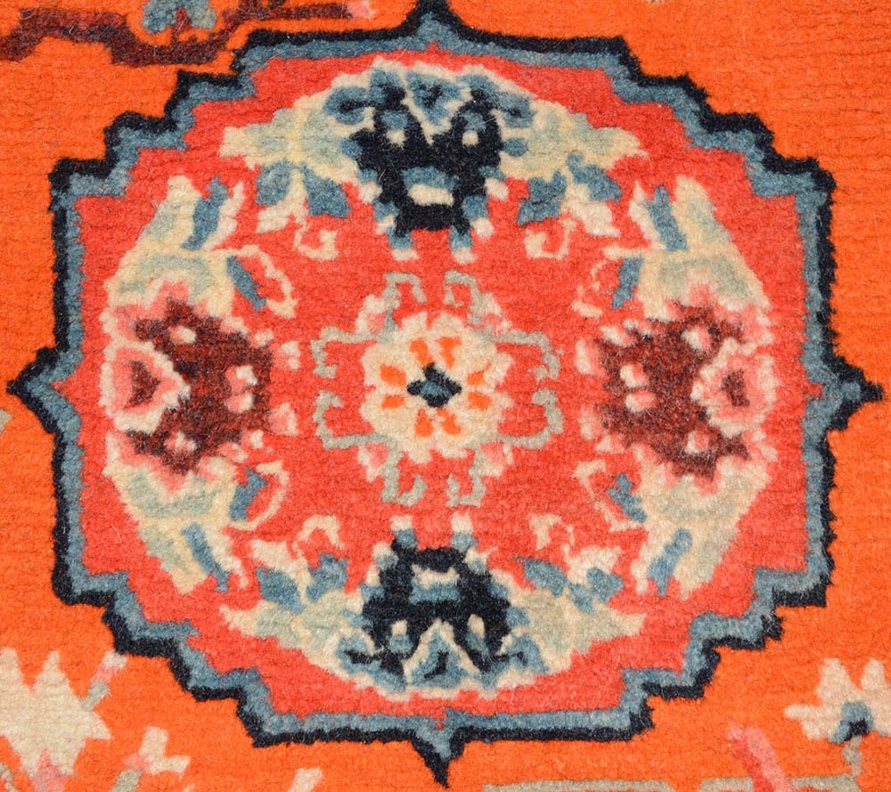 Tibetan under-saddle carpet or ‘makden’ joined (as is often the custom for this type of saddle carpet) in the center with a strip of naturally dyed blue nambu cloth and the back-side of the carpet covered with blue cotton cloth, and is slightly 'wasp-wasted' in shape. a floral mandala-type roundel is the main motif on either side while the overall orange coloured pile may suggest it was meant for an ecclesiastical person. Only two of the four girth strap holes have been cut open for use, the other two left as woven (a close-up of which can be seen above). The narrow outer border is made of a red nambu cloth covering a thick felt that was a common post-weave addition to protect the edges of a saddle carpet from fraying. a mix of wool and hair weft with a cotton warp, and a mix of organic and aniline dyes, the natural dyed pale blue pile either side of the central nambu cloth showing a lovely subtle abrash. Made circa 1920 it is in excellent condition. Size 130cm x 60cm (approx. 51in x 23.5in). https://warpandweft.club/portfolio-item/makdens-mashos/
