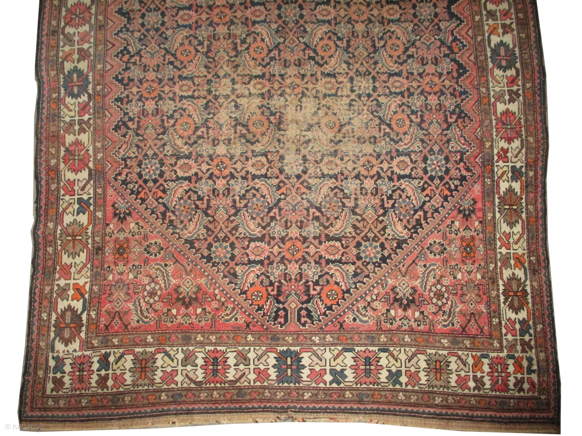 The black knots are oxidized, the knots are hand spun wool, all over Herati design, the background color is indigo, the surrounded large border is ivory, the four corners are terracotta, both edges are woven 2 to 3cm kilim, at the background certain places are used, finely knotted and in its original shape.